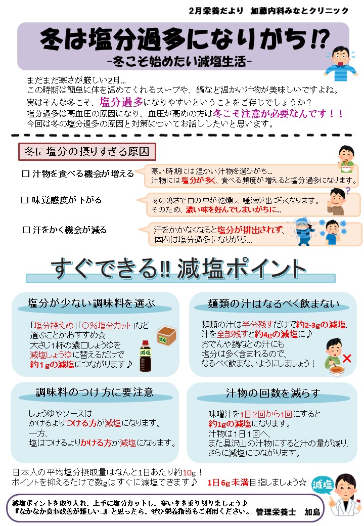 栄養だより(2月)冬は塩分過多になりがち⁉ - 加藤内科みなとクリニック
