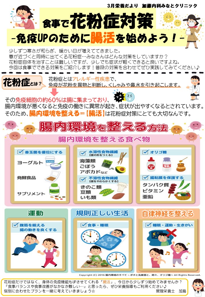栄養だより(3月)【食事で花粉症対策-免疫UPのために腸活を始めよう!】 2025年3月6日 栄養だより(3月)【食事で花粉症対策-免疫UPのために腸活を始めよう!】 詳細はこちらをご覧ください。 « 前へ | お役立ち情報一覧 | 次へ »