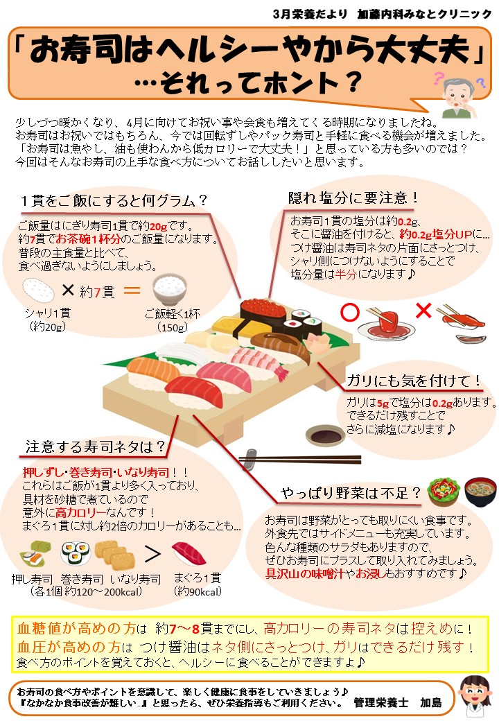 栄養だより(3月)お寿司はヘルシーって本当? 2024年2月24日 2024年3月「お寿司はヘルシーって本当?」 のお話です。 詳細はこちら をご覧ください。 « 前へ | お役立ち情報一覧 | 次へ »