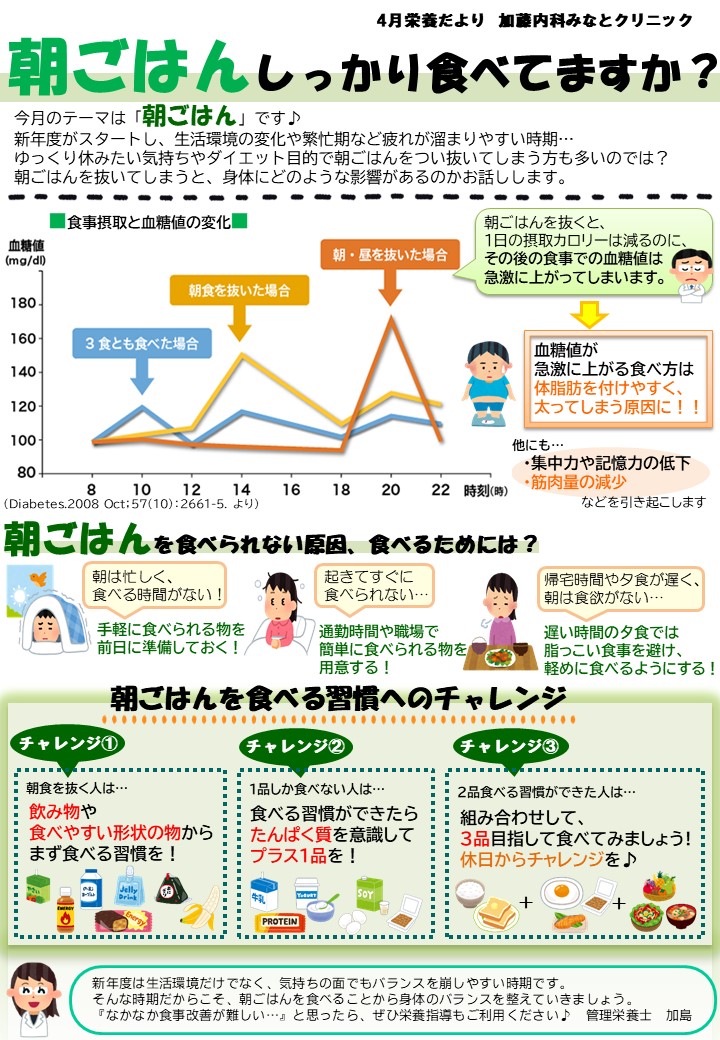 栄養だより(4月)【朝ごはんしっかり食べてますか?】 2025年3月30日 栄養だより(4月)【朝ごはんしっかり食べてますか?】 詳細はこちらをご覧ください。 « 前へ | お役立ち情報一覧 | 次へ »