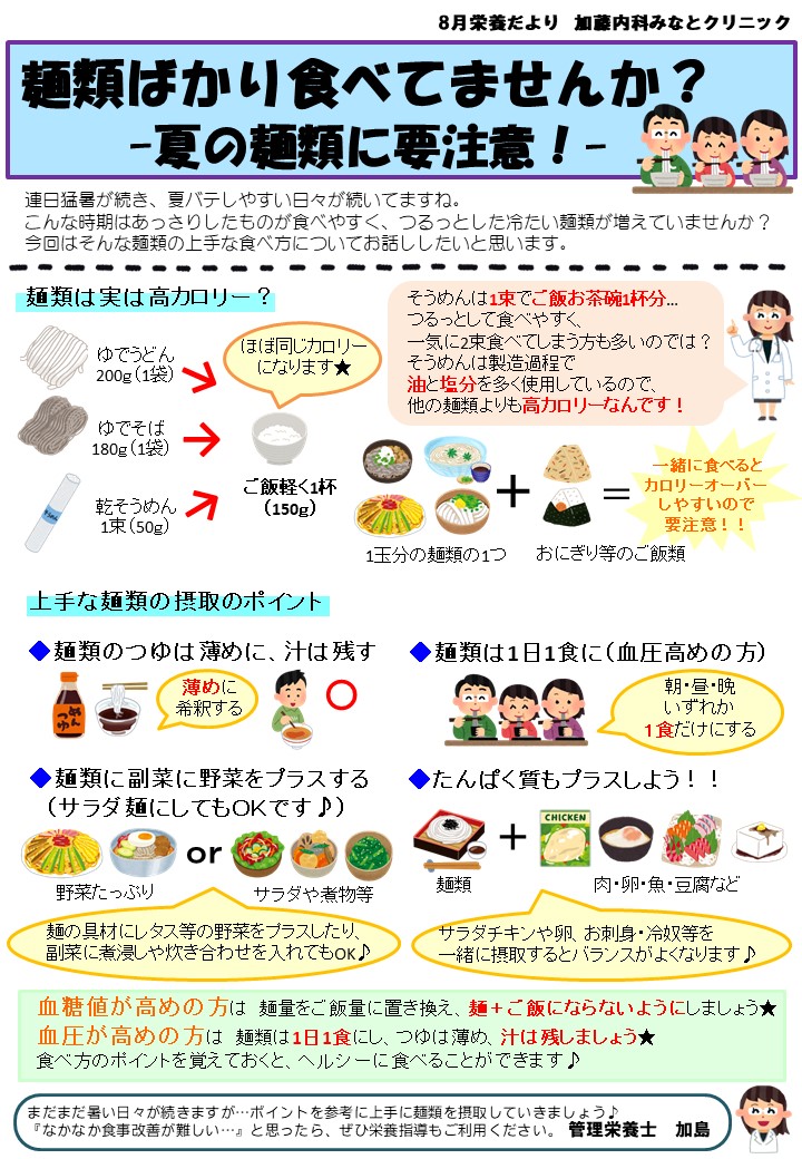 栄養だより(8月)「夏の麺類に要注意!」 - 加藤内科みなとクリニック