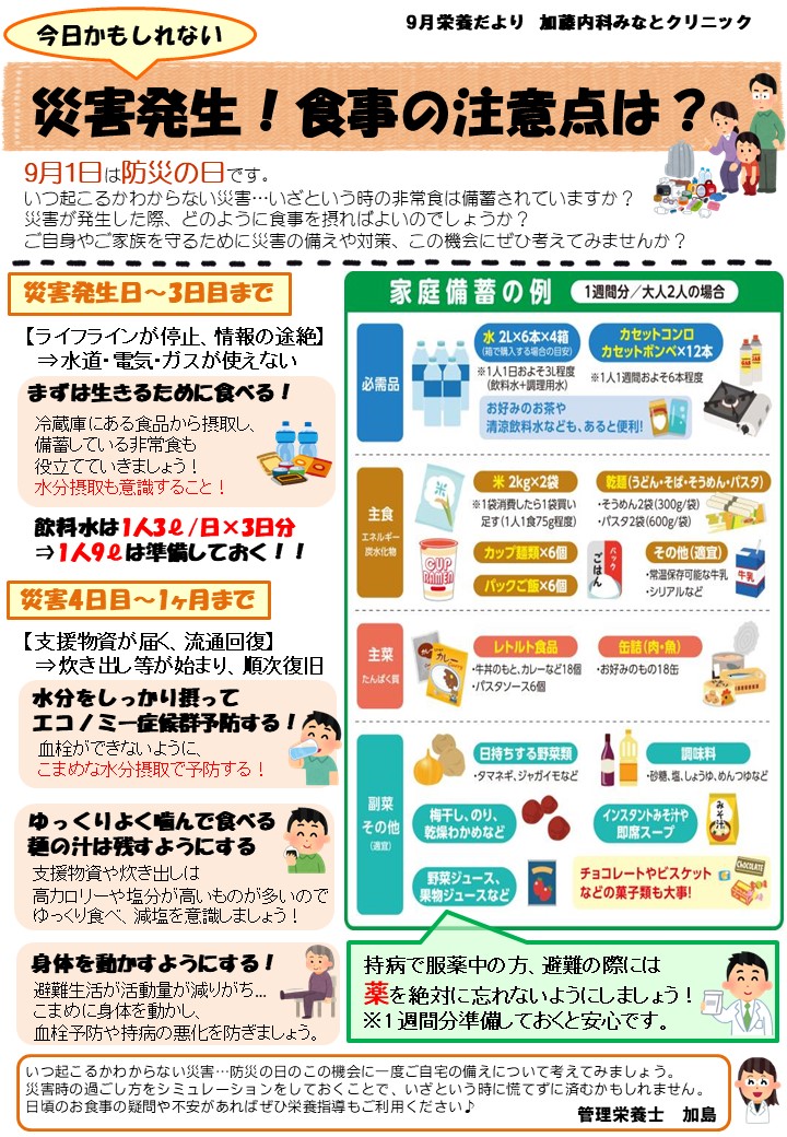 栄養だより(9月)【災害発生!食事の注意点は?】 - 加藤内科みなとクリニック