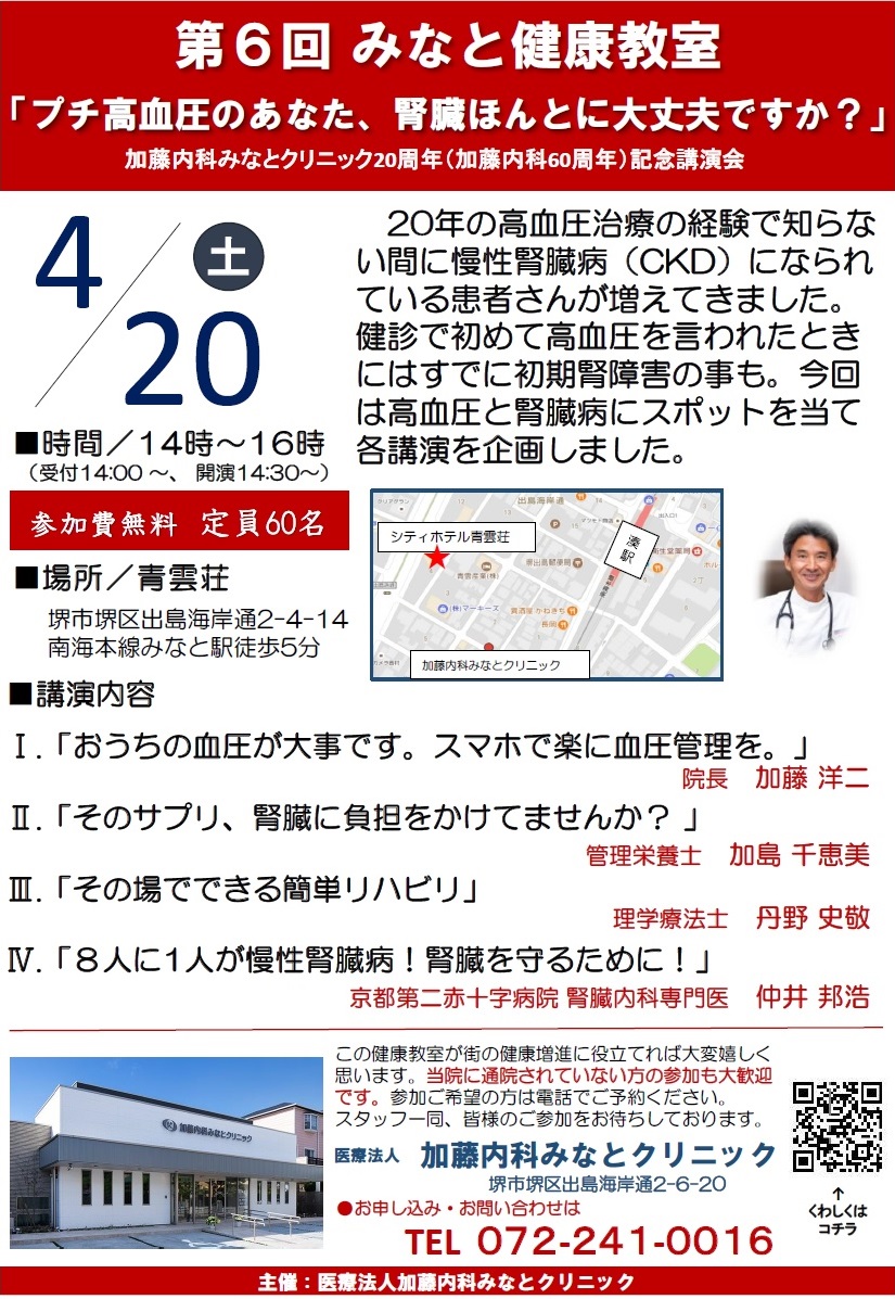 加藤内科は1963年に、加藤内科みなとクリニックは2003年に開設され、加藤内科60周年、加藤内科みなとクリニック20周年となりました。つきましては、その記念講演として「第6回みなと健康教室」を開催することにしました。命題は「高血圧と腎臓」です。高血圧は様々な臓器障害を知らない間に起こしてしまいます。血圧上昇をどうやって把握するのか、腎臓の悲鳴をどうやって聞いてあげるのか、皆さんと一緒に考えたいと思っております。健診で何度か高血圧を指摘されている方は特に必見です。初めての方、大歓迎です。お電話でご予約ください。よろしくお願いいたします。
