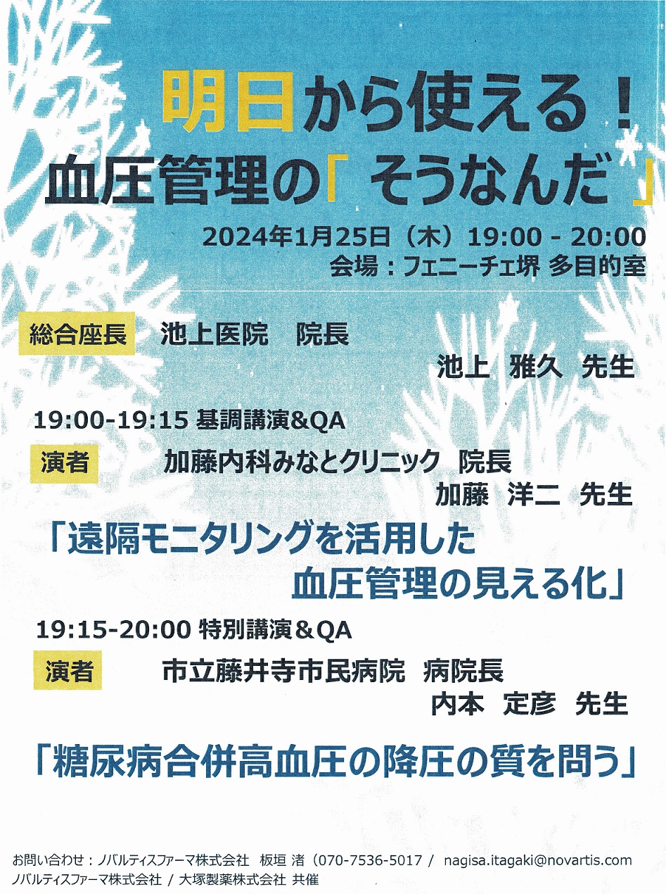 「遠隔モニタリングを活用した血圧管理の見える化」を講演しました。 2024年3月7日 明日から使える! 血圧管理の「そうなんだ」 にて、演者として 「遠隔モニタリングを活用した血圧管理の見える化」を講演しました。 « 前へ | 院長のつぶやき部屋一覧 | 次へ »